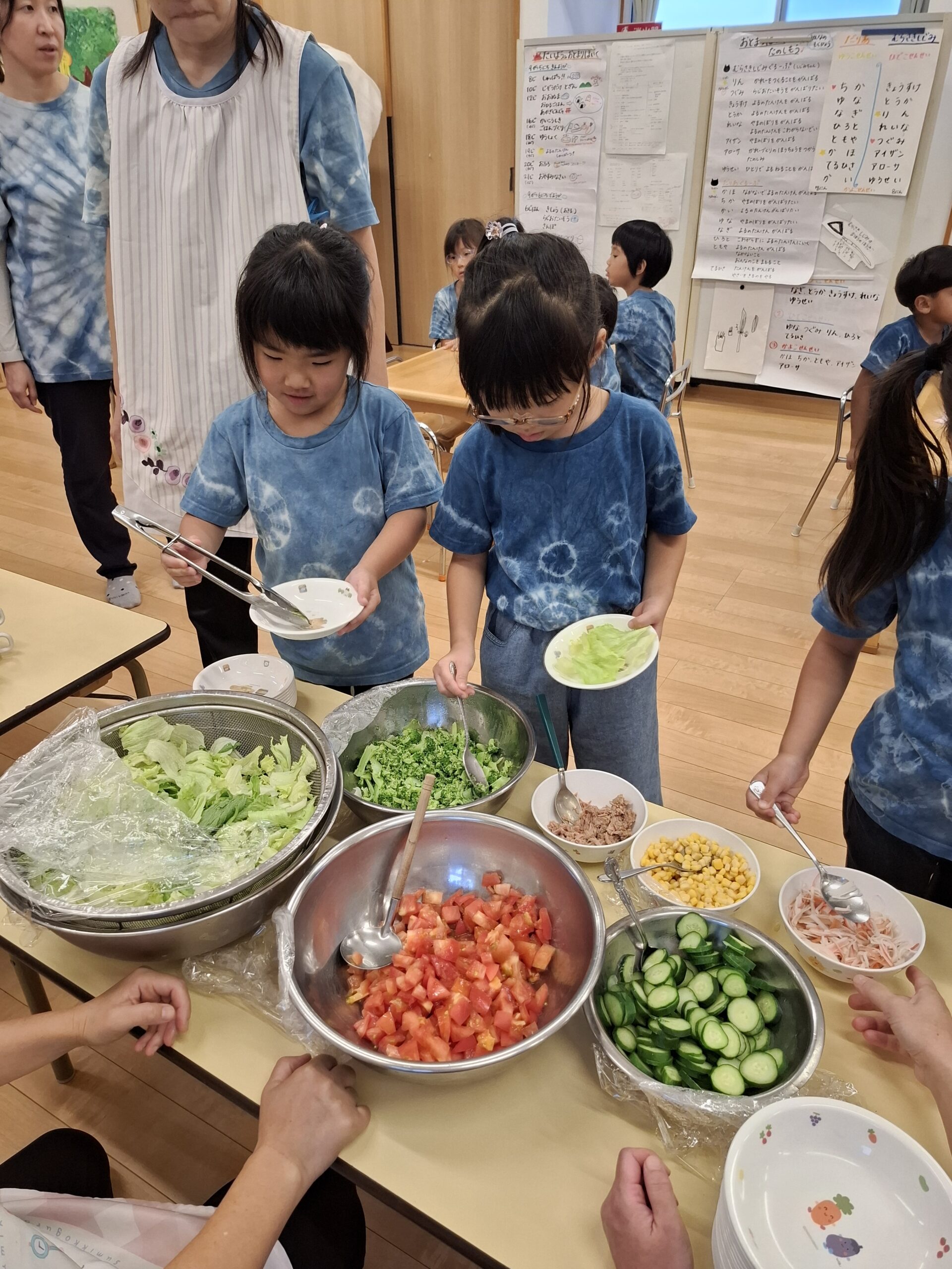 みんなで作った夕食、とても美味しくできました。他にも夜レクやめだか温泉など盛りだくさんなお泊まり保育でした。