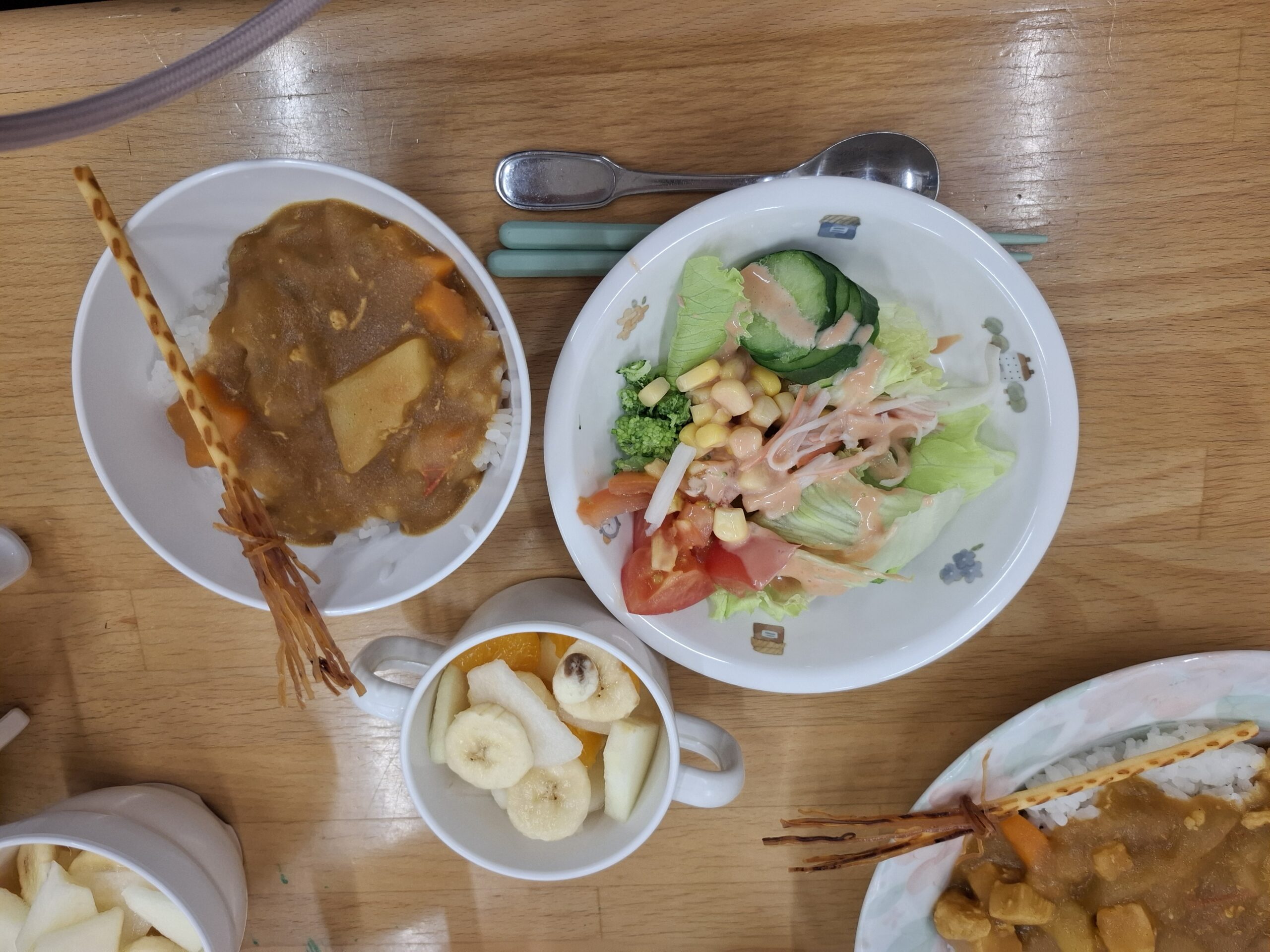 夕食はカレー・サラダ・フルーツポンチ。先生に手伝ってもらいながら野菜や果物を一生懸命に切っていました。