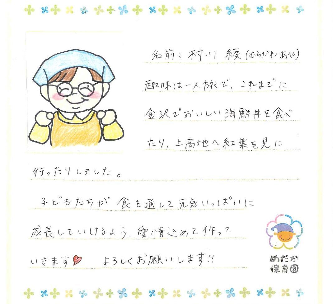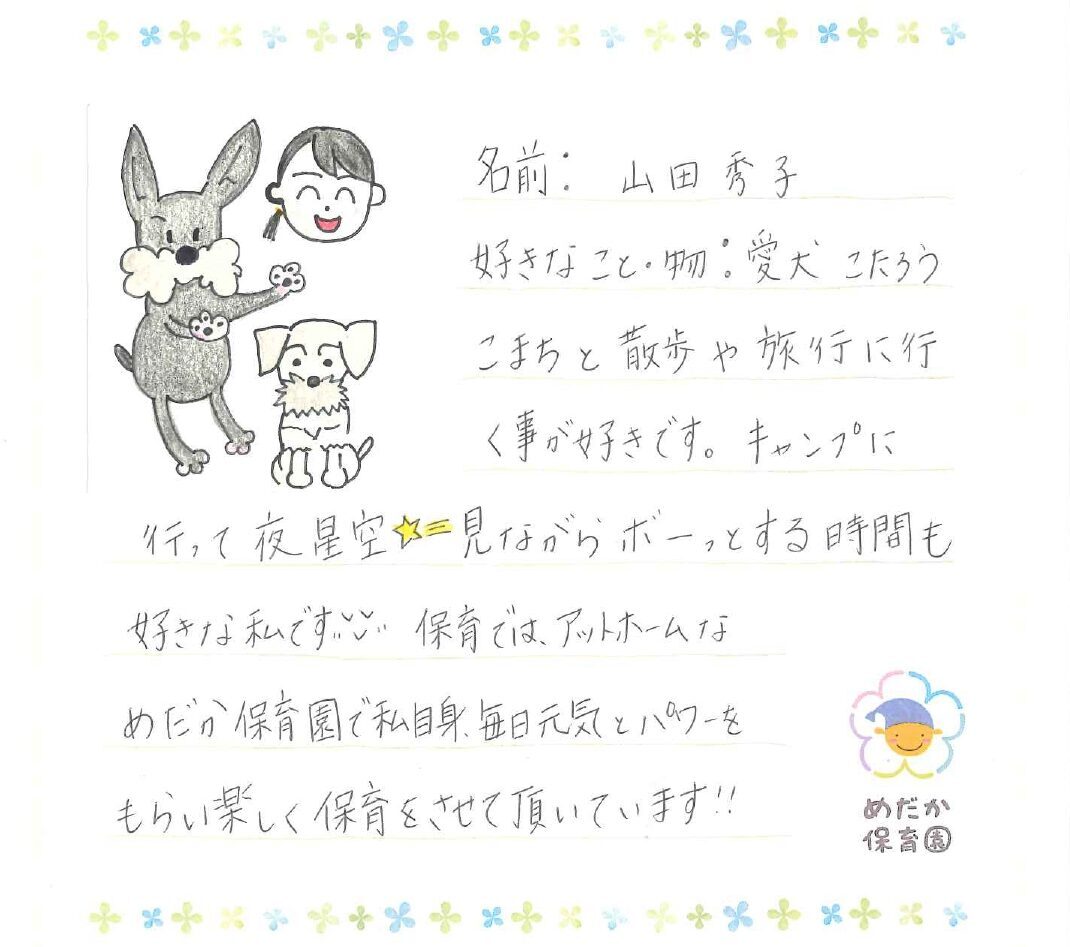 平林直美です。二人の息子たちに手がかからなくなり、家でまったりとする時間が増えてきました。めだか保育園のみんなとたくさん遊んだり、笑ったり、毎日を楽しくすごせたらを思っています。よろしくお願いします。